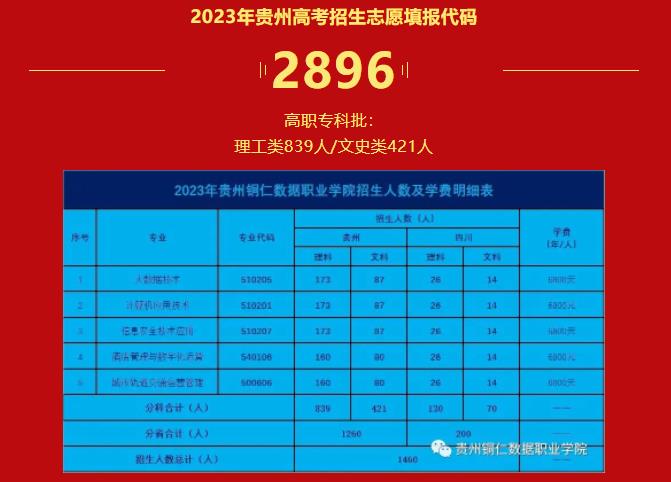 2023年贵州高考招生志愿填报代码2896,高职专科批:理工类839人/文史类421人,2023年贵州高考招生专业目录指引。