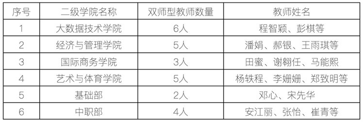 教师是立教之本、兴教之源。教育部通过建设团队、国外研修、全员培训等举措,推动职业院校“双师型”教师扩大规模、提升素质、优化结构,为职业教育现代化提供有力支撑和保障。目前,我院双师型教师有25人,其中大数据技术学院6人、经济与管理学院5人、国际商务学院2人等。