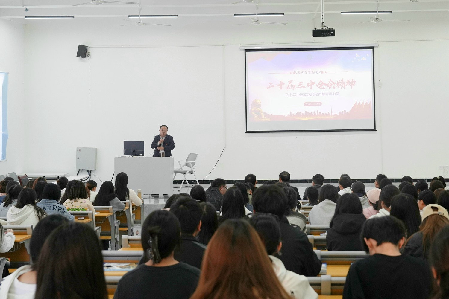 为认真学习宣传贯彻党的二十届三中全会及全国教育大会精神,教育引导广大师生深入理解、全面把握会议精神,2024年11月11日12:30,我院邀请校党总支肖洪涛书记在二号阶梯教室作《认真学习贯彻党的二十届三中全会精神 为书写中国式现代化贡献青春力量》的专题讲座,我院全体教师及我院与数字技术学院近200名学生参加了此次讲座。
