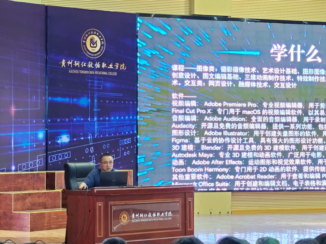 数字媒体技术专业负责人冉智精老师则展示了该领域的最新进展和创意实践案例。冉老师鼓励学生发挥创意、勇于表达,运用数字媒体技术创造更多有价值的作品,为文化传播和产业发展贡献力量。