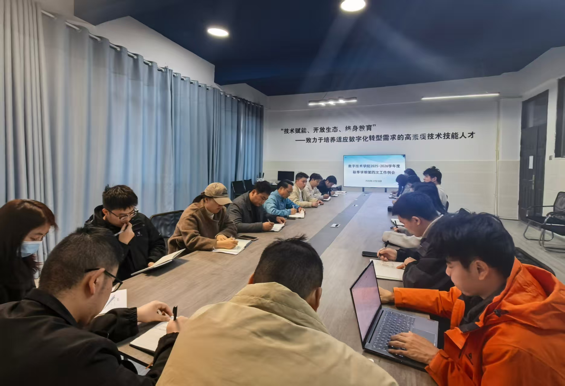12月11日下午,数字技术学院2025—2026学年第一学期第四次工作例会在1-106活动室顺利召开。会议由冉智精老师主持,学院全体教职工参加。