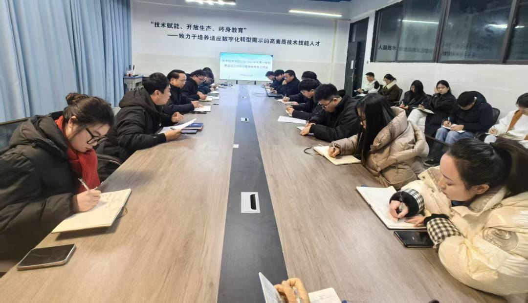 2025年12月31日,数字技术学院在学院楼1106活动室召开期末教学工作部署会暨学院第五次工作例会,统筹安排期末考试、教材选用论证及学院常规工作。会议由教师冉智精主持,全体监考教师及教职工参加。