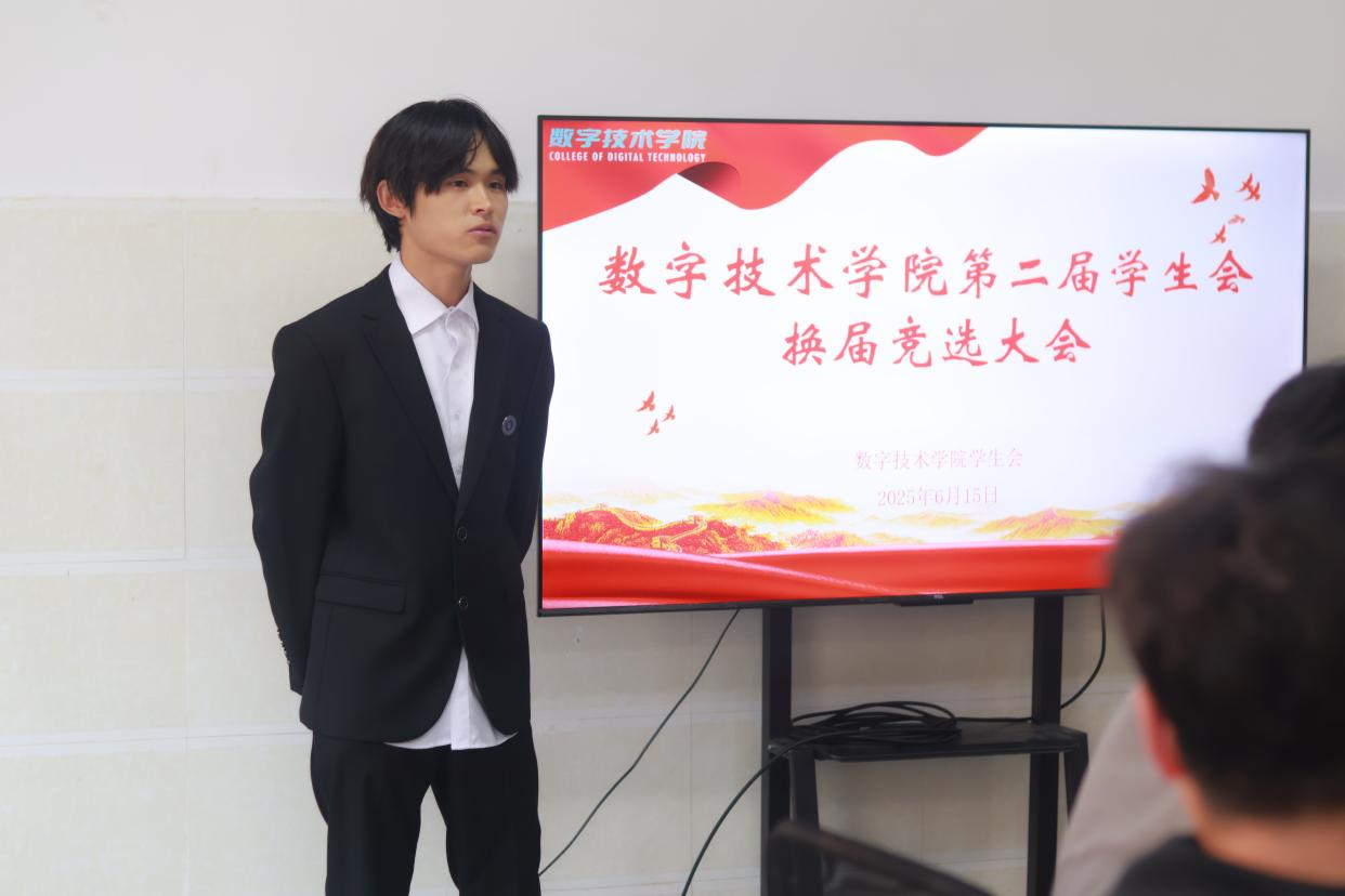 6月15日,数字技术学院第二届学生会换届竞选大会在1号教学楼1106会议室顺利举行。学院团总支书记田伟、辅导员代表及2023级、2024级学生代表共50余人齐聚一堂,共同见证新一届学生会干部团队的诞生。
